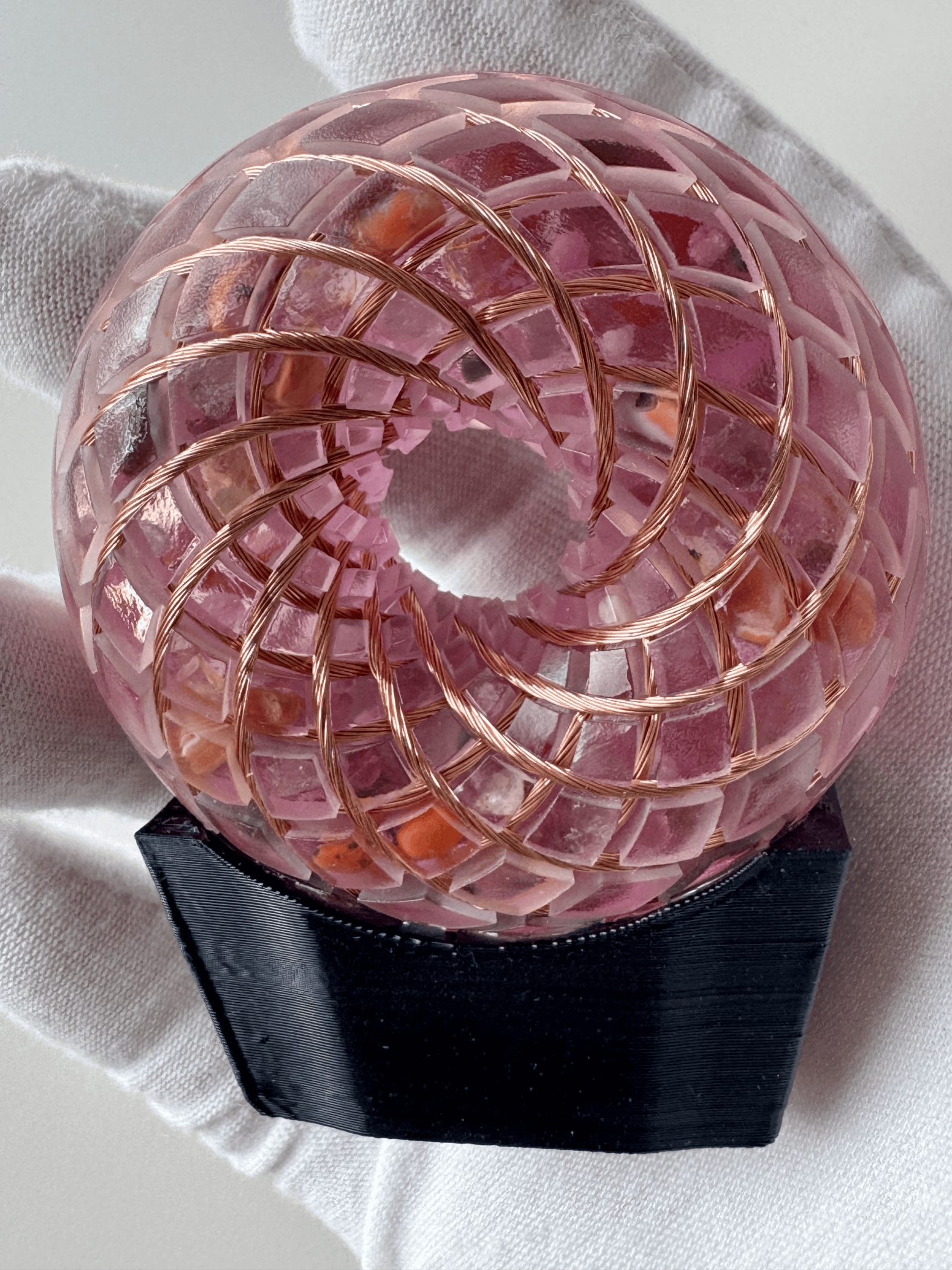 This handmade Rodin Coil Orgonite toroidal features embedded crystals and draws inspiration from sacred geometry. Ideal for meditation, chakra harmony, and aligning your personal energy—great for your home, studio, or spiritual journey.